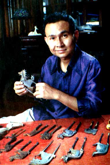 My first piece in the collection came from Nakhon Si Thammarat in southern Thailand. It's a singha- (lion) shaped cutter, outstanding because of its authentic Thai handle. But it's not as flamboyant as the ones 1 bought from Indonesia. When 1 journeyed to Java in 1994, 1 came across other pieces of hinged two-bladed instruments in the shape of animals such as a horse, bird, rabbit, lion or even in human shapes, with gold and silver inlay. Every design distinguished itself from another, which made every single piece so interesting to me. My favorite piece is also made in Java. It's singha-shaped and inlaid with golden wire. Spectacular.