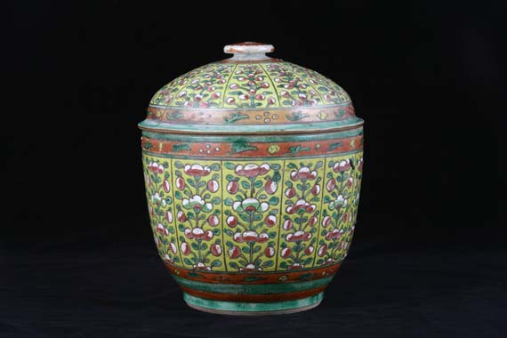A water (“toh”) jar, probably late 19th century. The body is decorated with vertical panes of pink and green flowers with white accents and leaves against a yellow background, red bands at the upper and lower body with a green ring around the mouth; a red band separates green bands on the lower body and the foot. The vertical arrangement of the motif on the body is a motif associated with the Himaphan forest. See 000060 for a description of the cover of this piece. |