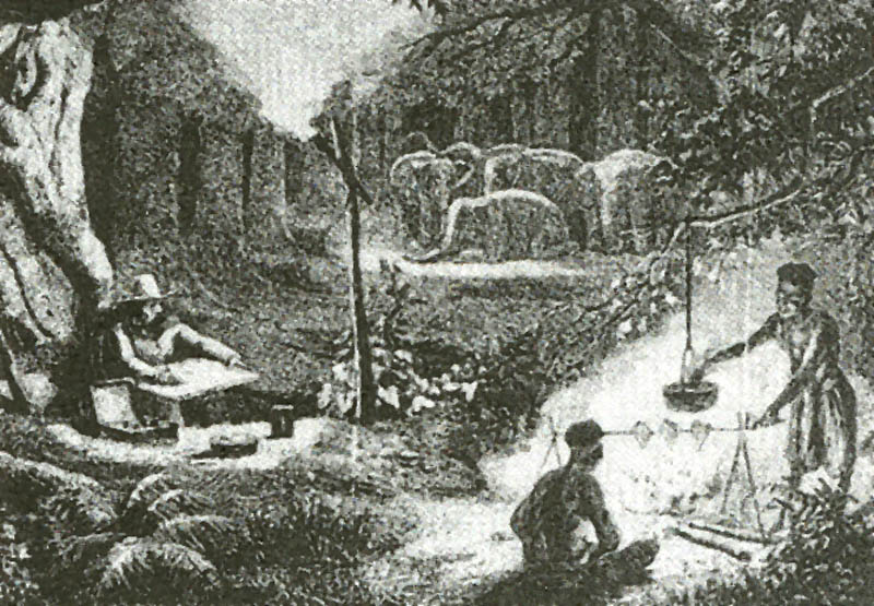 | Henri Mouhot sitting at thefoot of a tree and drawing Laos; wild elephants (background); servants preparing food (foreground) (Drawn by A. Poccourt from a sketch by H. Mouhot) |