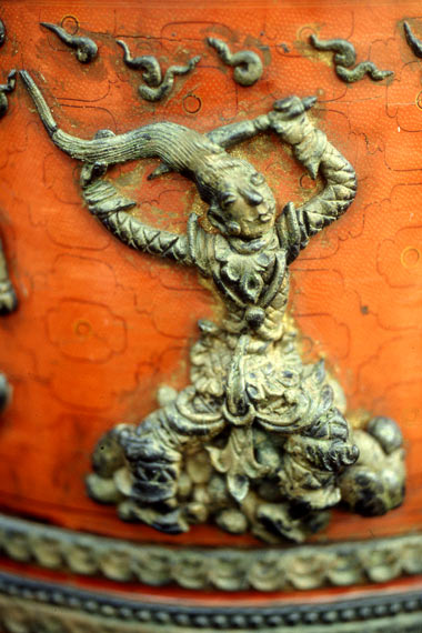 A 20th century red lacquer cylindrical box for betel chewing ingredients (H=23 cm). The cover and the body are approximately the same size and fit together tightly. The elaborate decoration on this box is executed by applying high-relief figures in silver. The images depict characters from the epic tale, Ramayana, |