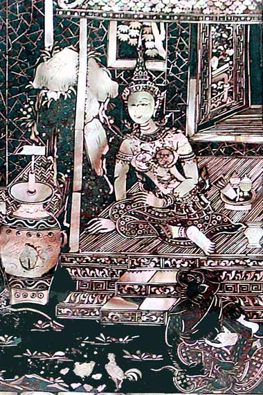 Photograph by Tom Riddle A princess sitting gracefully under a porch of a royal building with a betel set on the left. For a close-up view of the betel set, click here. This scene is depicted on the doors of the ordination hall at Wat Phra Jetapon, popularly known as Wat Po, Bangkok’s oldest and largest temple. The doors are decorated in mother-of-pearl, a method also used for betel boxes both in Thailand and Vietnam. Pearl chips are inlaid on to a dark background. |