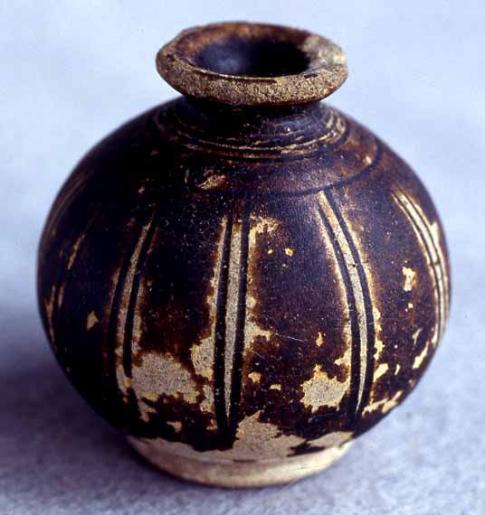 Pot; diam. 4 cm; first half 12th century; brown monochrome. With spherical-shaped body, short narrow neck, everted rolled mouth rim, and button-shaped foot; incised rings around neck; body divided into sections by pairs of vertical lines. Buff clay; brown glaze. |